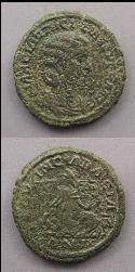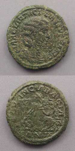 Dacia standing between a lion and an eagle, holding sword and two standards with the numbers V and XIII