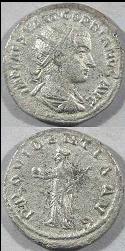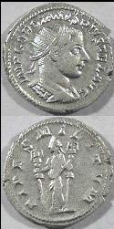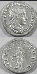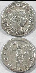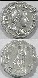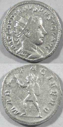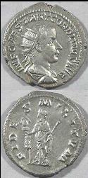 The eastern mint at Antioch presents a fascinating study of the coiange of Gordian III by itself. The mint at Viminacium was established during the first years of Gordian III's reign and was originally thought to be the source of these coins. Later studies placed the mint at Antioch. Production was halted from AD 240 to sometime in AD 242 when the Persians invaded the region. No direct evidence exists as to whether Antioch was captured during the early stages of the invasion or was temporarily closed as a precaution. The fact that Persian history makes no mention of the capture of Antioch during this campaign suggests the mint was closed by the Romans. Production was resumed after the Roman Army routed the Persians at Rasaina and the Romans regained control of the region.The coins from Antioch can be challenging to identify. Some are readily identifiable from their Rome mint counterparts by style or combination of obverse and reverse legends. Others, even the experts sometimes disagree on. As I have primarily relied on others for the attribution of the coins shown below, please feel free to contact me if you disagree with the attribution of one of the coins to Antioch. I personally have troubles establishing the differences between the two mints on certain coins.At some point in time a study of the coinage of this mint will be located or developed and the information presented on this site.