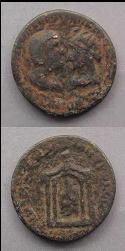 Tetrastyle shrine containing City goddess seated facing on rock, river god Orontes swimming at her feet, above shrine, ram running right.